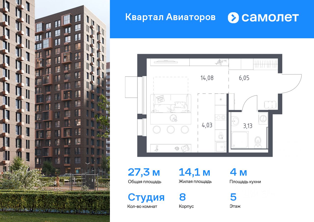 Предлагается квартира студия комфорт-класса 26,9 кв.м в корпусе 8 на 5 этаже, в ЖК ''Квартал Авиаторов''
