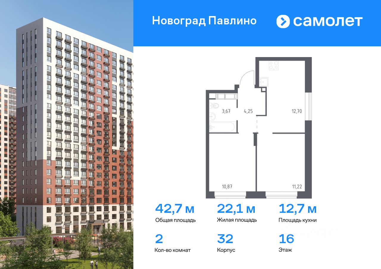Предлагается 2-комнатная квартира комфорт-класса 42,7 кв.м в корпусе 32 на 16 этаже, в ЖК ''Новоград Павлино''